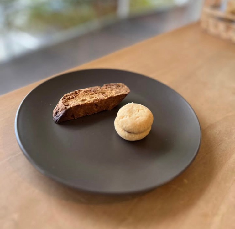 店内で展示中のレシピ絵本「おばあちゃん直伝のレシピブ ック ピノッキオと巡るイタリアお菓子の旅」のレシピの 中から、チョコレートクリーム入りクッキー「バーチディ ダーマ」と黒胡椒風味のビスコッティ 「ペパテッリ」をつ くり、「イタリアお菓子の旅」セットと名付けて販売して います。テイクアウトもできます。