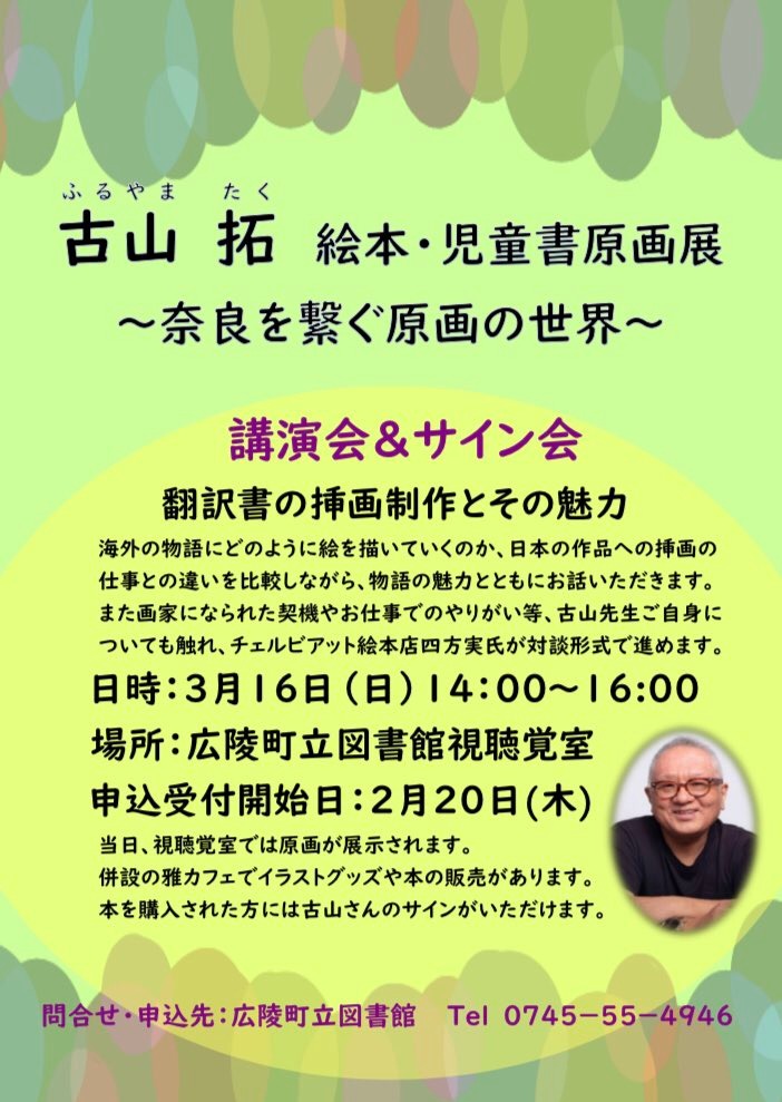 3月16日には奈良で画家の古山拓さん(@takufuruyama )の「絵本の挿画」にまつわる講演もあるのでぜひご参加頂けると幸いです。